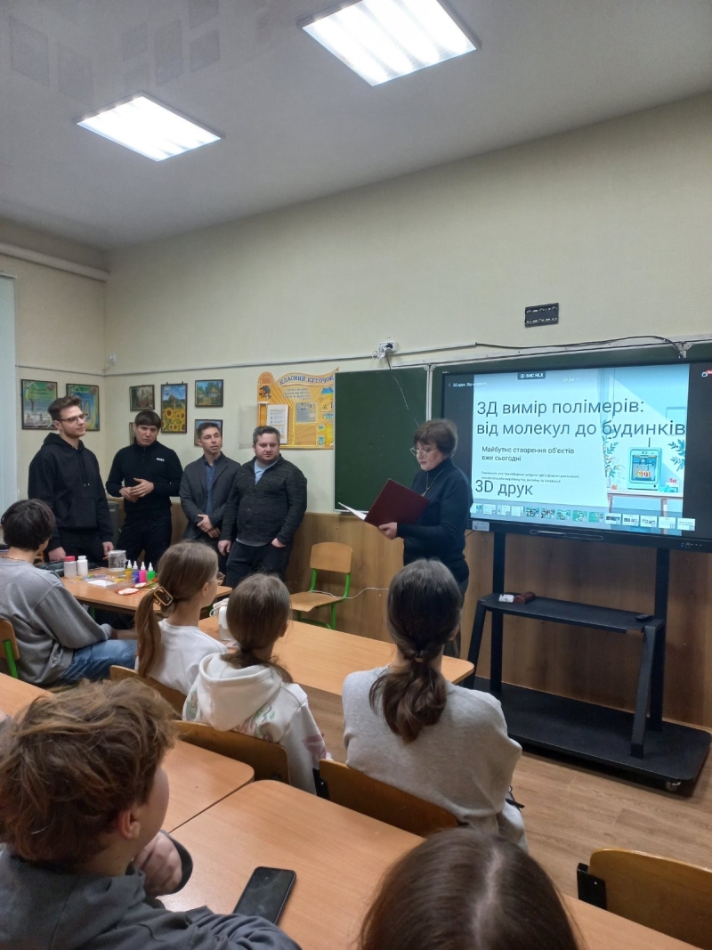 У ліцеї відбувся профорієнтаційний науково-популярний майстер-клас «3D-вимір полімерів: від молекул до будинків». Ініціатива належала Лідії Петрівні Бондаренко, завідувачці відділу культурно-просвітницької роботи науково-технічної бібліотеки НТУ «ХПІ». До зустрічі долучилися викладачі кафедри технології пластичних мас і біологічно активних полімерів - професор Володимир Лебедєв, доцент Артем Карєв, старший викладач Андрій Воронкін. А містком між університетською наукою і школою стали вчителі ліцею - Олена Сергіївна Візерська, учитель хімії, та Владислав Олексійович Циганенко, учитель інформатики.