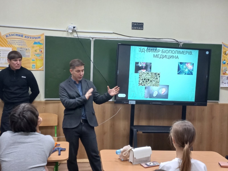 Школярі дізналися, як працює 3D-друк на молекулярному рівні, чому біодрук клітин уже не фантастика, а реальний інструмент сучасної медицини, і як полімери дозволяють створювати як дрібні деталі, так і великі конструкції для інженерії та будівництва. Складні речі пояснювали просто, так, щоб хотілося слухати далі.