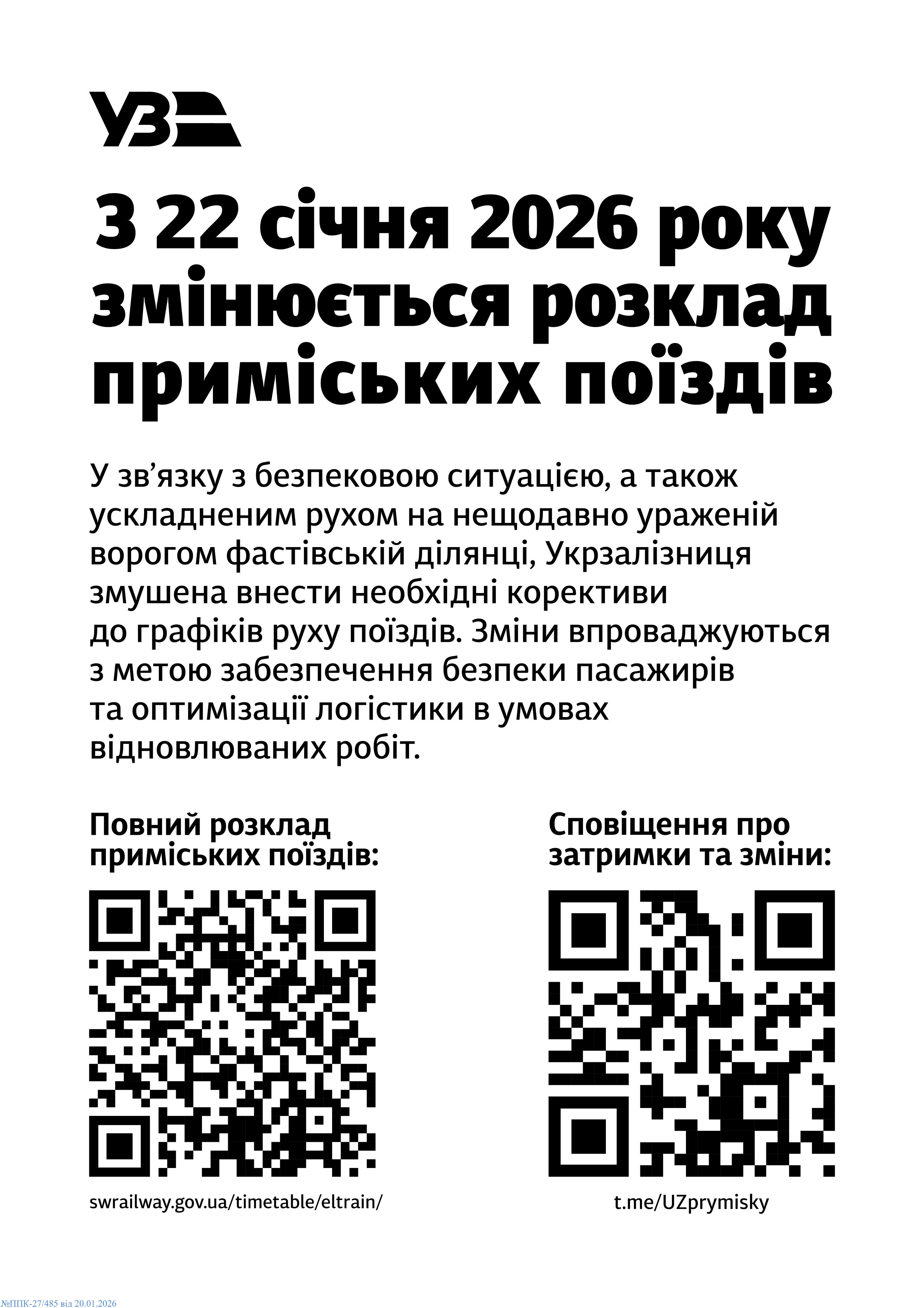 АТ «Укрзалізниця»: З 22 січня 2026 року змінюється графік руху приміських поїздів