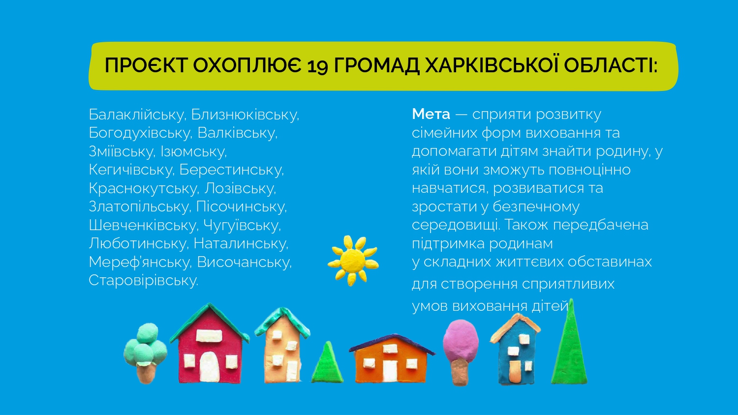 Проєкт ЮНІСЕФ «Посилення альтернативного догляду через підтримку реформи кращого догляду в Харківській області» реалізується благодійним фондом «Волонтери: дорослі – дітям» спільно зі службою у справах дітей Харківської обласної військової адміністрації та Харківським обласним центром соціальних служб за фінансової підтримки урядів Франції та Ірландії, а також Федерального міністерства економічного співробітництва й розвитку Німеччини через банк розвитку KfW.