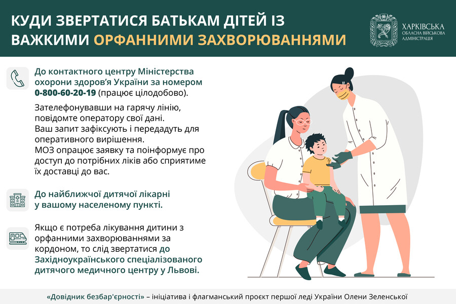 3. До департаменту охорони здоров’я (контакти – за посиланням). Якщо є потреба лікування дитини з орфанними захворюваннями за кордоном, то слід звертатися до Західноукраїнського спеціалізованого дитячого медичного центру у Львові.