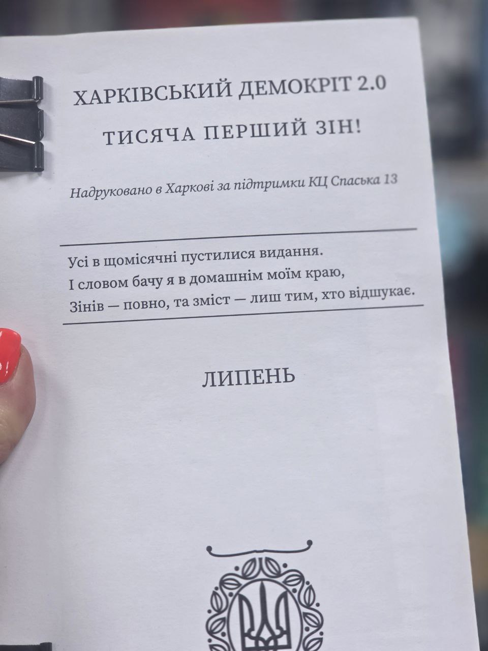 У другій частині зустрічі гості презентували власний зін «Харківський Демокріт 2.0». Видання присвячене 200-річній садибі у Люботині, яка сьогодні перебуває в аварійному стані. Через тексти, фото та ілюстрації авторки нагадують: історична пам’ять потребує уваги і турботи.