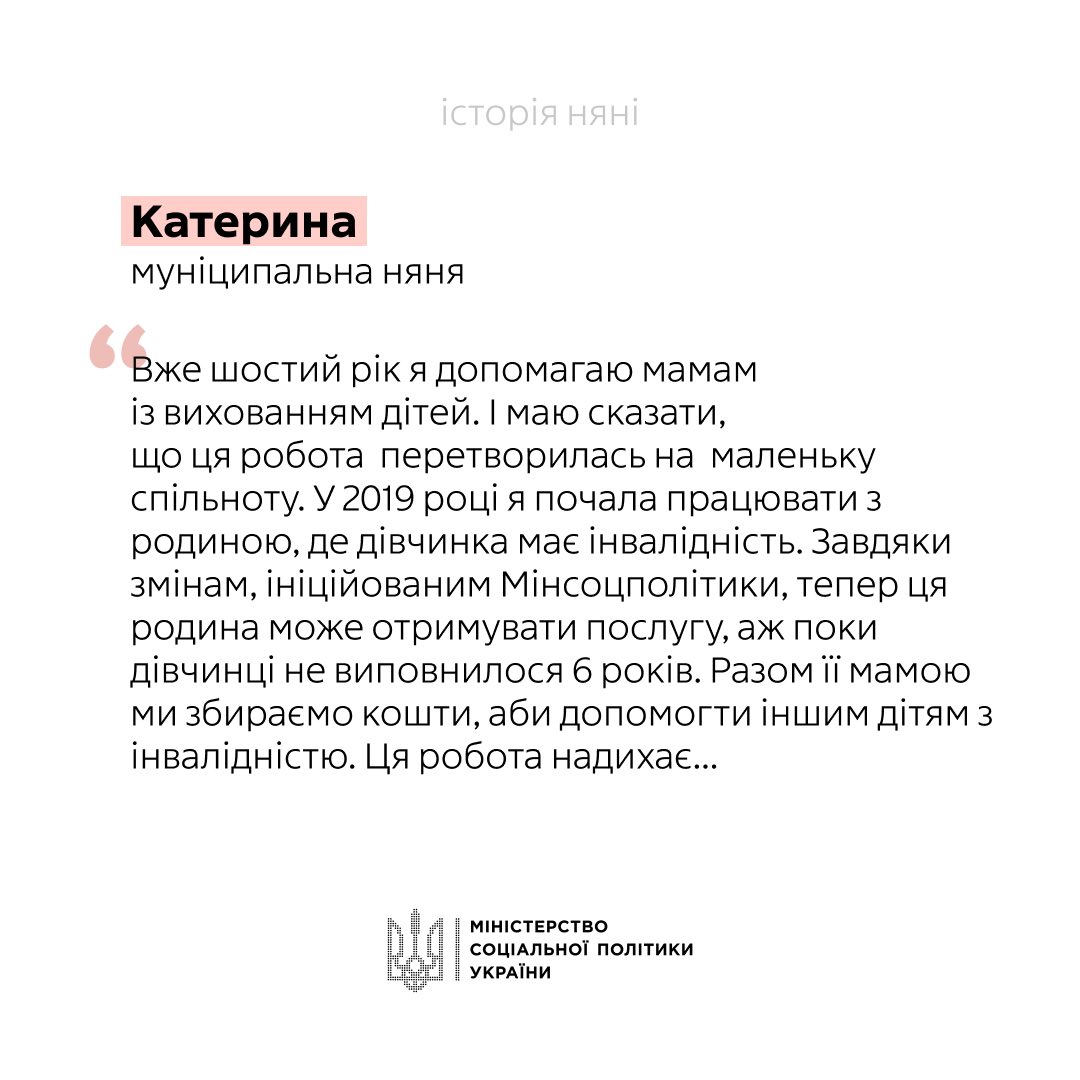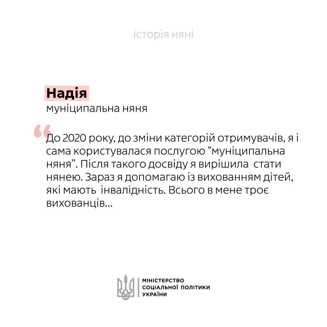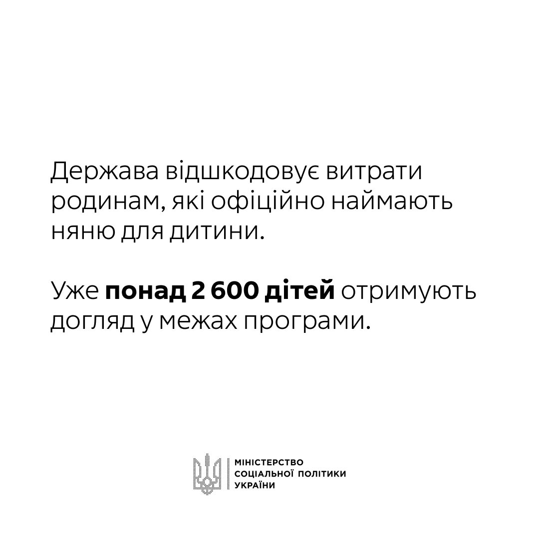 Відповідно до постанови Кабінету Міністрів України «Деякі питання надання послуги з догляду за дитиною до трьох років «муніципальна няня»» від 30січня 2019 р. № 68 (зі змінами), українські родини можуть офіційно наймати няню для дитини, а держава відшкодовує кошти на оплату її послуг. Розмір відшкодування становить 100% мінімальної зарплати у погодинному розмірі, встановленої станом на 1 січня відповідного року, за одну годину догляду, але не більше ніж 165 годин на місяць.