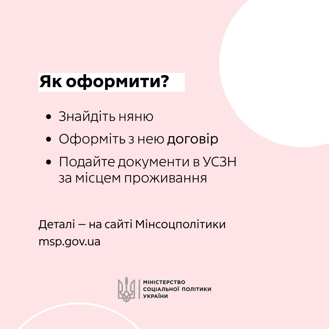 Знаходьте муніципальну няню, укладайте з нею договір і звертайтеся за компенсацією до місцевого органу соціального захисту населення.