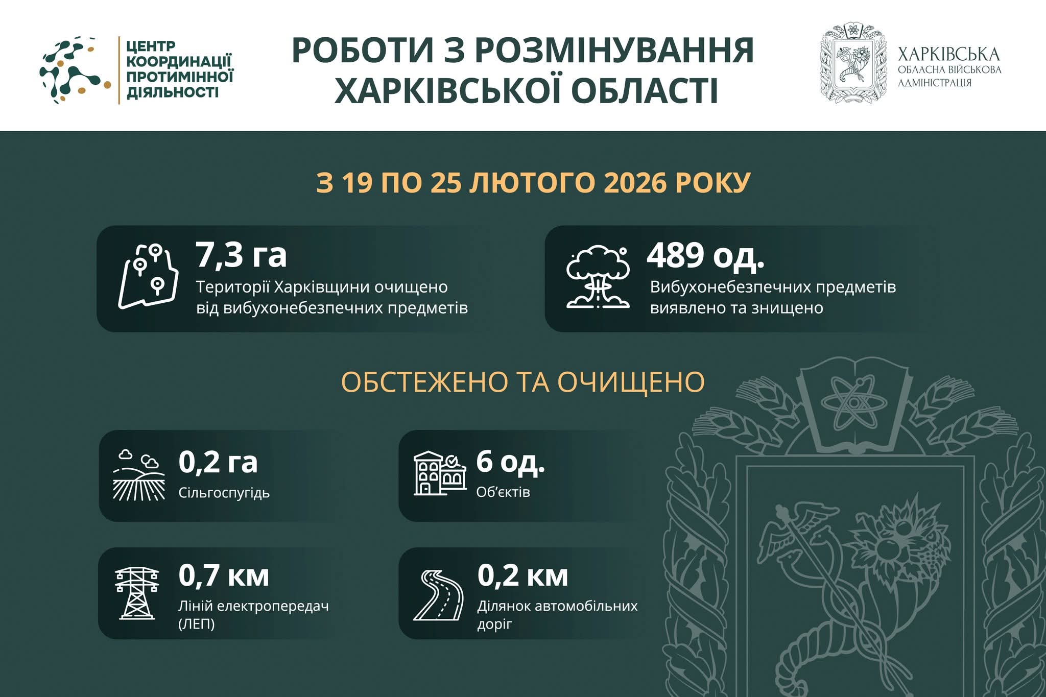 Упродовж 19–25 лютого піротехнічні підрозділи Харківської області розмінували понад 7 гектарів території та виявили і знешкодили 489 вибухонебезпечних предметів. Про це повідомляє Харківська обласна військова адміністрація.