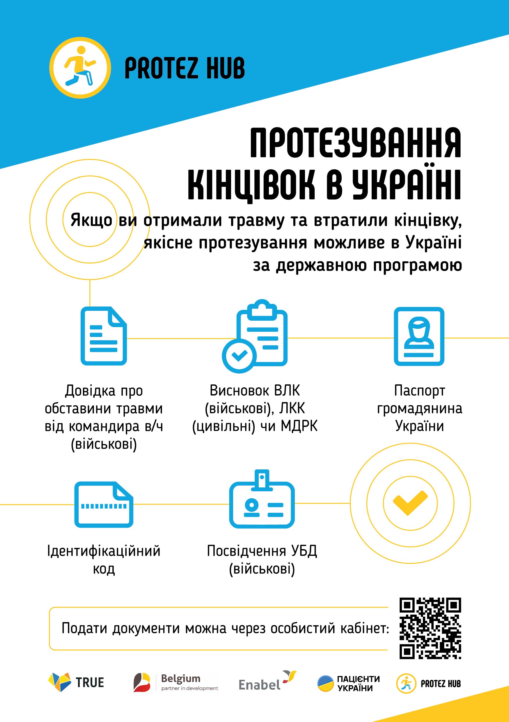 Благодійна організація «Благодійний фонд «ПРОТЕЗ ХАБ» (Protez Hub) разом з Міністерством цифрової трансформації України, Міністерством соціальної політики, сім’ї та єдності України та Фондом соціального захисту осіб з інвалідністю розробили інформаційні буклети про державну програму протезування верхніх та нижніх кінцівок – від підготовки кінцівки до механізмів забезпечення додатковими засобами реабілітації (протезами, ортезами, допоміжними засобами реабілітації).