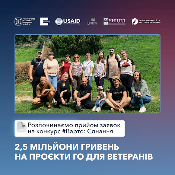 Громадські інституції, які працюють на підтримку ветеранів та членів їх сімей, зможуть отримати від 800 тис. грн до 2,5 млн грн фінансової підтримки у межах нового конкурсу "Варто: Єднання".