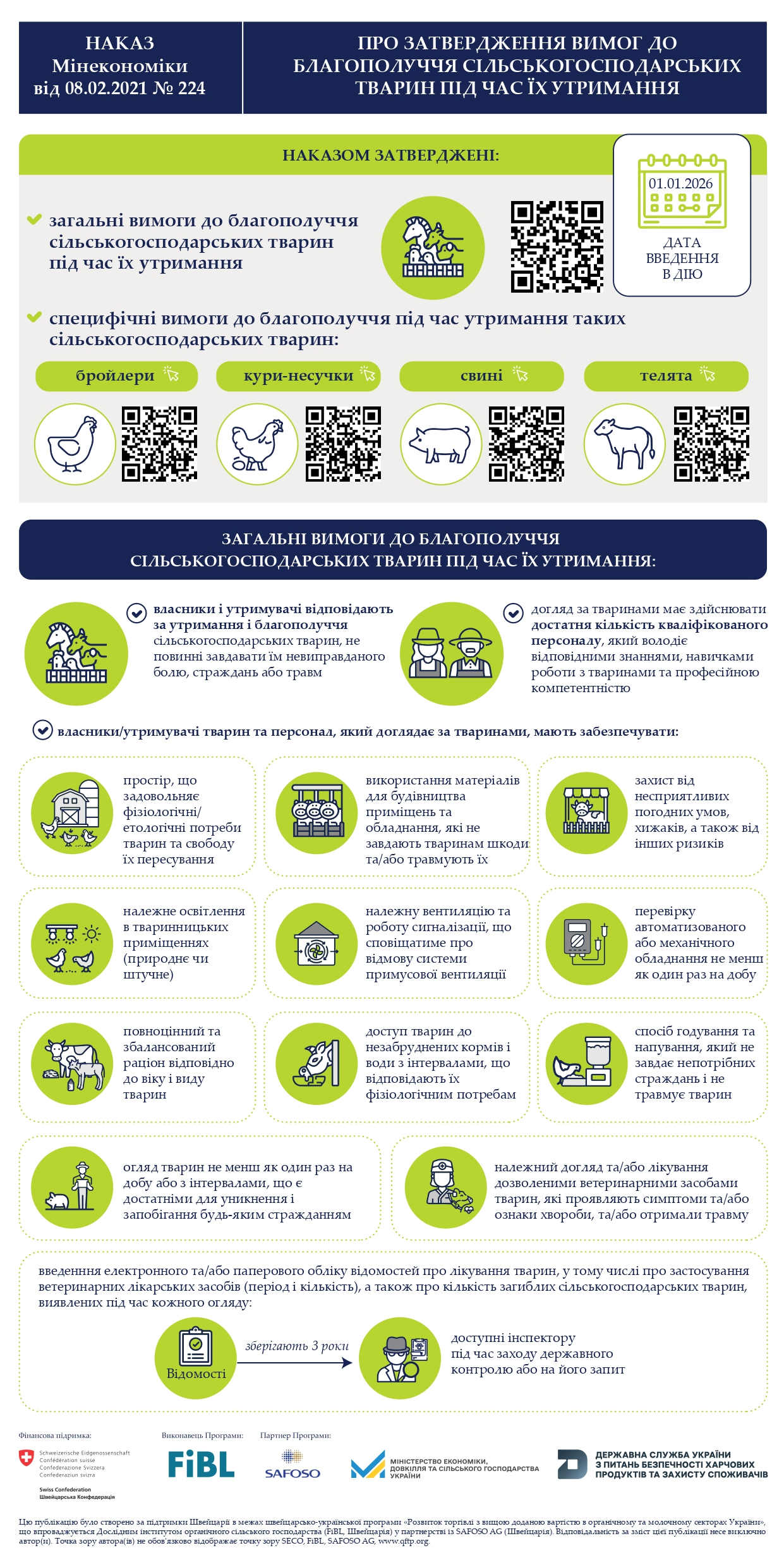 За підтримки Швейцарії, у межах швейцарсько-української програми «Розвиток торгівлі з вищою доданою вартістю в органічному та молочному секторах України» (Quality FOOD Trade Program), що впроваджується Дослідним інститутом органічного сільського господарства (FiBL, Швейцарія) у партнерстві з SAFOSO AG (Швейцарія), Міністерством економіки, довкілля та сільського господарства України та Держпродспоживслужби створено інфографіку, в якій вказані загальні вимоги до благополуччя сільськогосподарських тварин під час їх утримання.