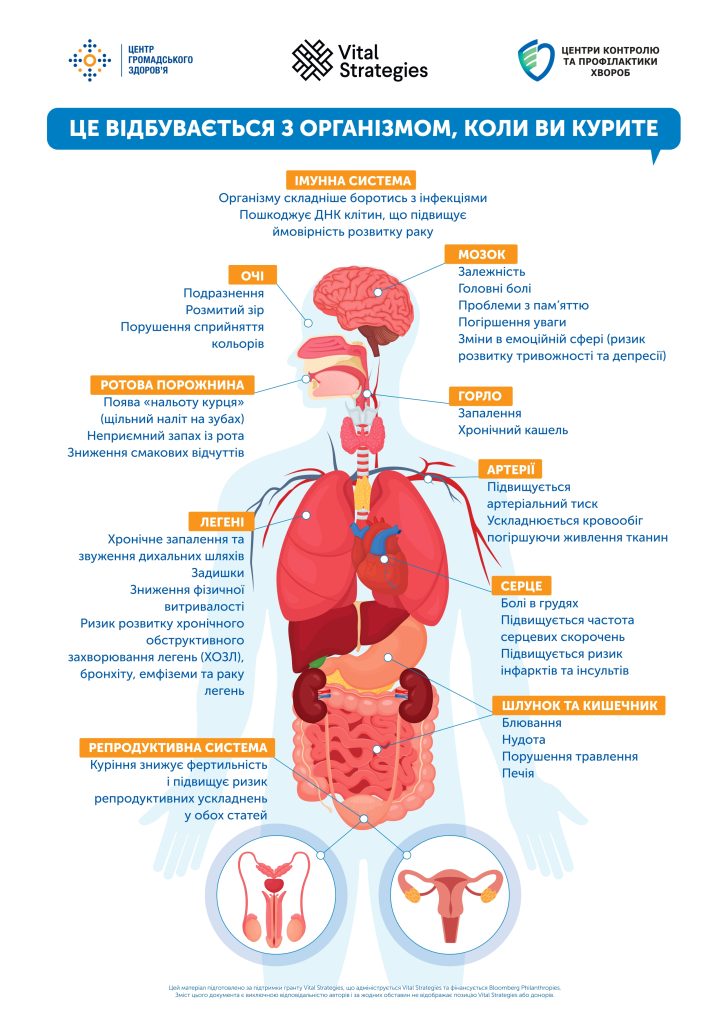 Крім цього, Центром також розроблено плакат «Що відбувається з організмом, коли ви курите» та ліфлет «Що варто знати про нікотин», який визнано Державною службою України з питань безпечності харчових продуктів та захисту споживачів соціальною рекламою.