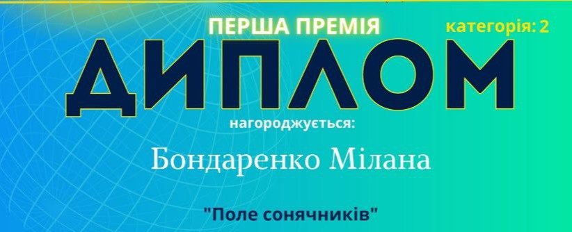 Бондаренко Мілана стала переможцем конкурсу та посіла 1 місце у номінації "Живопис", керівник Чурілова-Макаренко Алла Василівна.
