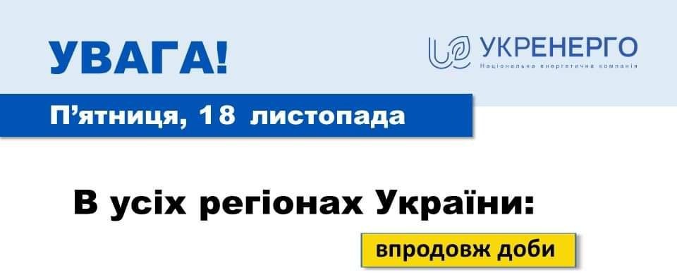 Сьогодні, 18 листопада, по всій Україні впродовж доби застосовуються графіки погодинних відключень. Можливе введення додатково аварійних відключень.